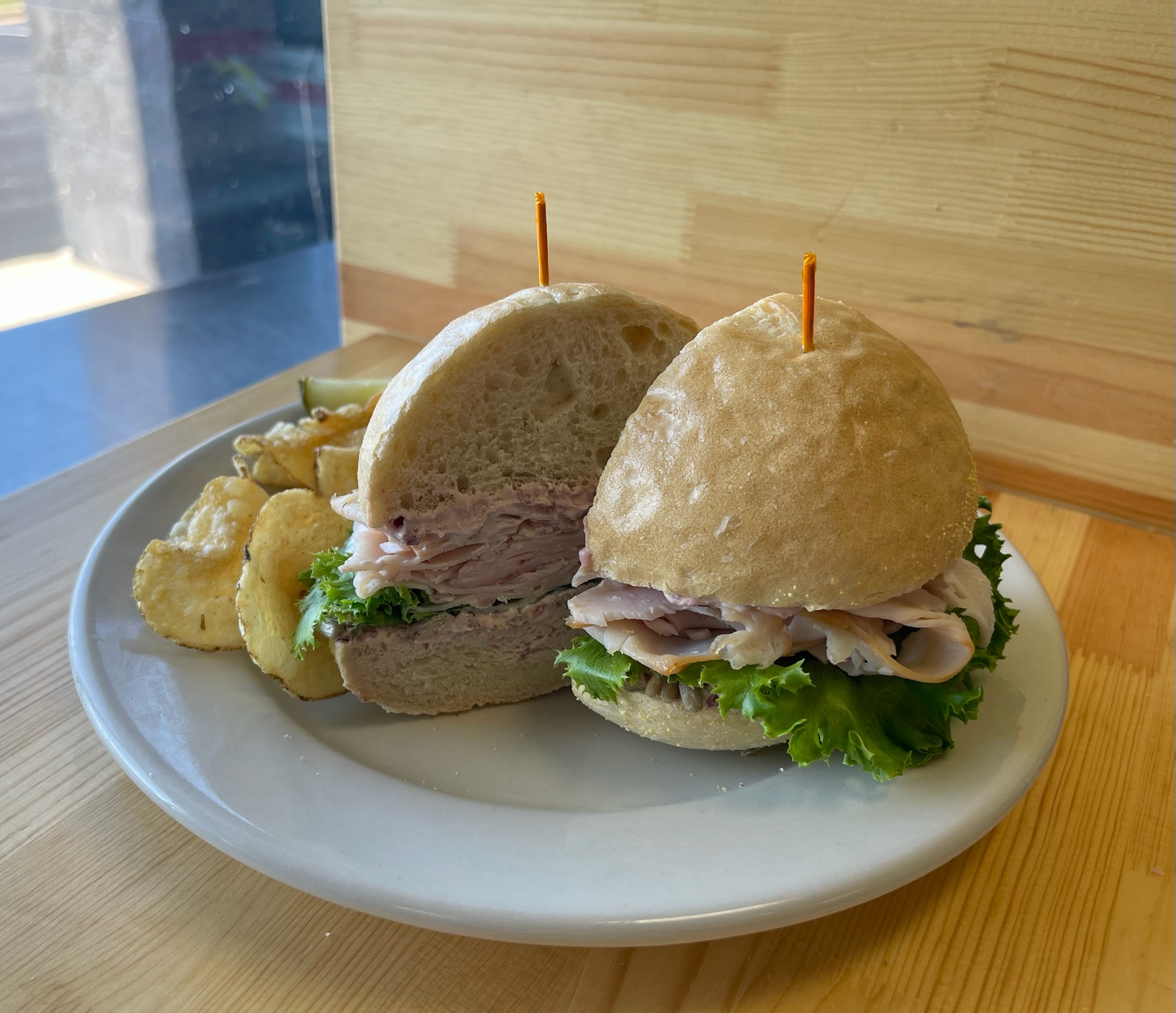 Served on a freshly baked French roll with cranberry cream cheese spread, sunflower seeds, and lettuce.